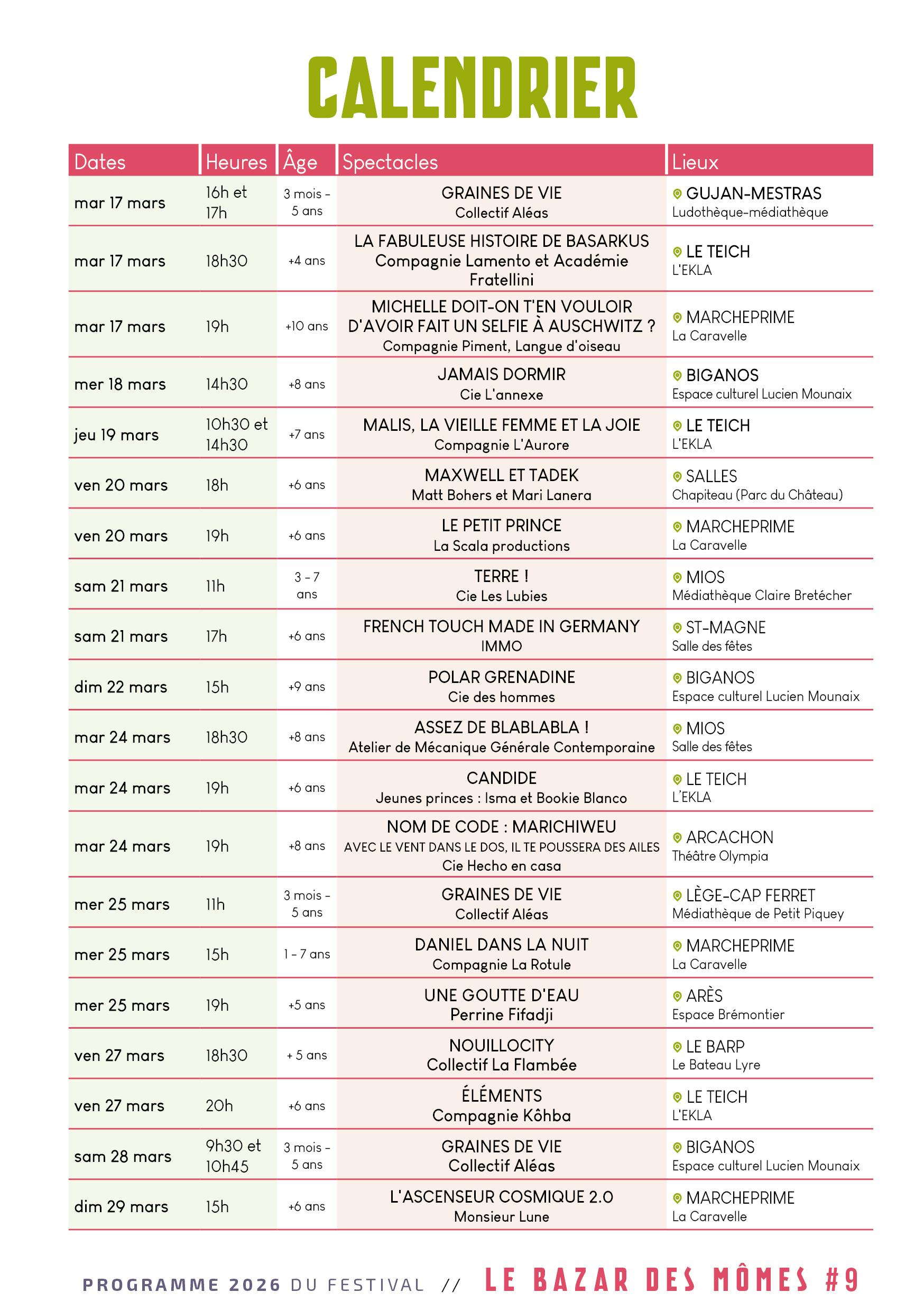 Le festival de spectacle vivant pour le jeune public et les familles LE BAZAR DES MÔMES revient autour d’une programmation éclectique, moderne et accessible répartie sur deux semaines de festivités du 17 au 29 mars, sur le territoire du Bassin d’Arcachon et du Val de l’Eyre. 😎