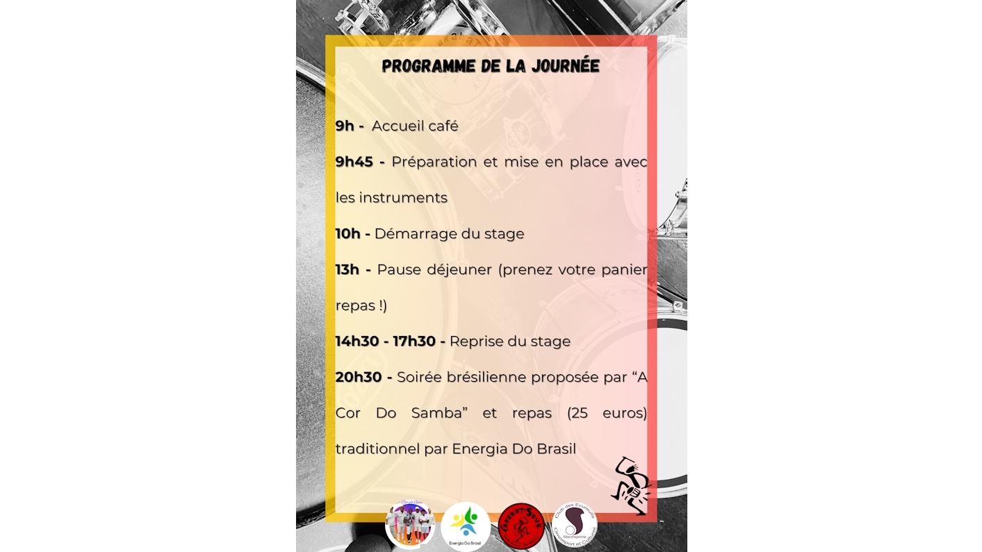 Nous vous proposerons une buvette avec une option de règlement en espèce uniquement ! Le stage se poursuivra par une soirée à la musique et à l'ambiance brésilienne avec le groupe "Cor Do Samba" et un repas au tarif de 25 euros proposé par Energia Do Brasil !