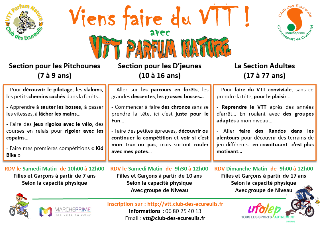 La Section VTT Parfum Nature est affiliée à l’UFOLEP, et elle existe depuis 1998 au sein du club des Écureuils. Elle propose une pratique ludique et conviviale du VTT sur le secteur de Marcheprime, Biganos, Lacanau de Mios, Mios.
